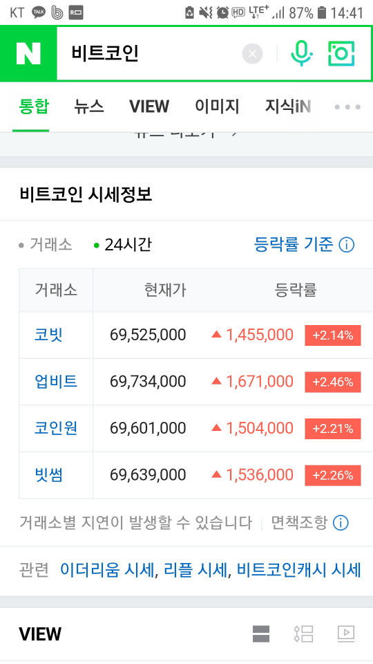 오전 보다 소폭 하락했다. 빗썸, 업비트, 코빗 등 모두 24시간 전 대비 0.39~0.99% 상승했다. 4개 거래소 모두 1비트코인 가격이 6900만원을 넘어섰다.
