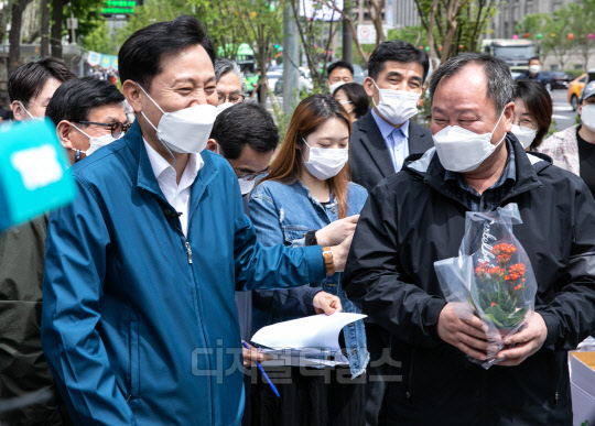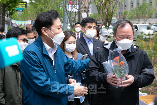 서울 세종대로 사거리에서 서울역까지 이어지는 세종대로 사람숲길 개장식이 6일 열렸다. 이날 행사에 참석한 오세훈(왼쪽) 서울시장이 완공된 길에서 구매한 꽃을 김인호 서울시의회 의장에게 선물하고 있다.
