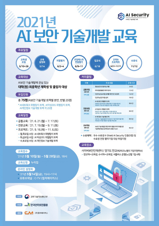 AI보안 기술개발 교육 사업은 구직자를 대상으로 정보보호 역량을 갖춘 초급인력을 선발해 AI보안 기술개발이 가능한 중급인력으로 양성하는 정보보호 전문인재 발굴 사업이다. 교육은 오는 10일부터 28일까지 3주간 AI보안 기술개발 교육 누리집에서 신청할 수 있다. 이후 지필평가와 면접전형을 거쳐 교육생을 선발하고 6개월여간 교육을 실시한다.