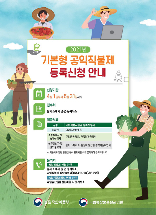 농림축산식품부는 오는 31일까지 '기본형 공익직접지불금(기본직불금)' 신청을 마감한다고 12일 밝혔다.
