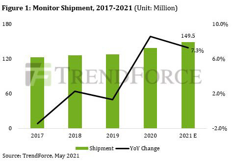 실제로 1분기 모니터 출하량은 전년 동기보다 무려 34.1% 증가했다. 트렌드포스는 2분기에도 작년 같은 기간보다 10% 이상 늘어날 것으로 추정했다. 특히 게이밍 모니터가 전체의 17.3%를 차지하는 등 성장세를 주도할 것으로 예상했다.