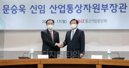 문승욱(왼쪽) 산업통상자원부 장관이 17일 서울 여의도 중소기업중앙회를 방문해 김기문 중기중앙회장과 기념촬영을 하고 있다.