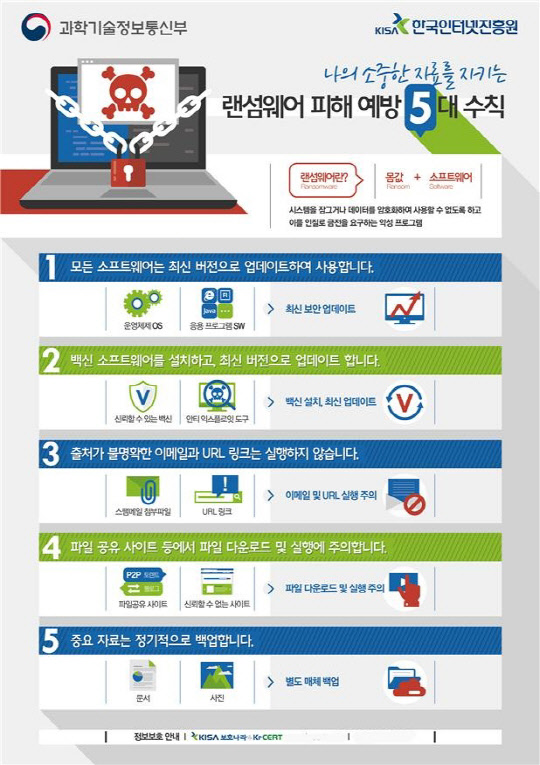 과기정통부는 랜섬웨어 피해예방 주요 대응방안으로 △최신버전 SW 사용·보안 업데이트 적용 △출처가 불명확한 이메일과 URL 링크 클릭 주의 △파일 공유 사이트 등의 파일 다운로드 주의 △중요한 자료 정기 백업 등을 당부하고 있다.