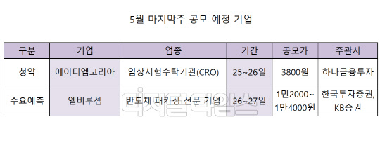 공모주 청약 시장의 활황 지속 여부의 시험대는 임상시험수탁기관(CRP)인 에이디엠코리아가 맡는다. 5월 마지막 공모 청약이다. 에이디엠코리아는 기관투자자 대상 수요예측에서 1515.98대 1의 경쟁률로 공모가를 희망 범위 최상단을 초과한 3800원으로 확정했다. 25일부터 이틀간 112만5000주에 대해 일반 투자자 대상 청약을 받은 뒤 다음달 중 상장할 예정이다.