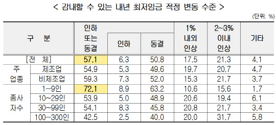조사에 따르면 중소기업의 57.1%는 내년도 최저임금을 동결(50.8%)하거나 인하(6.3%) 해야 한다고 응답했다. 특히 10인 미만 기업에서 최소한 동결해야 한다는 응답이 72.1%(동결 63.2%, 인하 8.9%)에 달해 양극화 양상을 보였다.