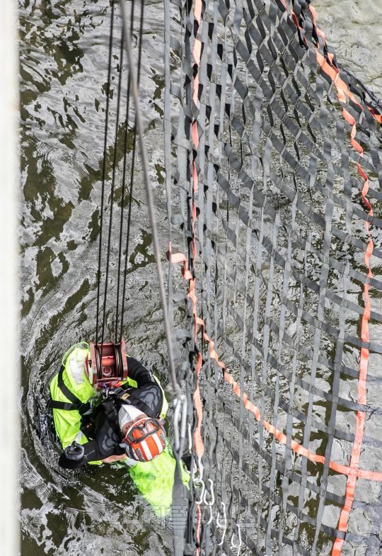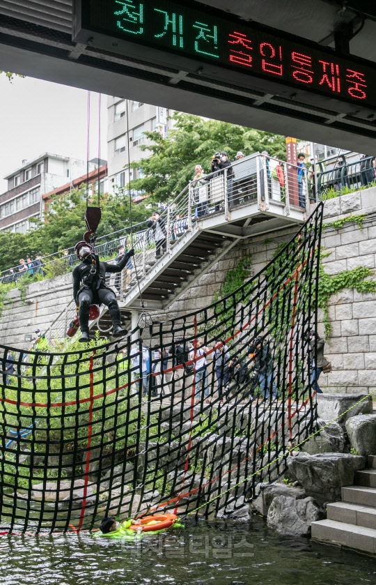 서울 종로구 배오개다리 인근 청계천에서 돌발 강수로 교량 하부 수문이 개방되어 익수자가 발생한 상황을 가정한 '청계천 시민 고립 대피 및 인명 구조 합동 모의훈련'이 26일 실시되고 있다.