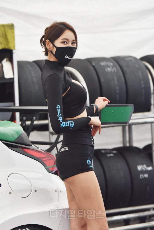 2K Body팀을 스폰서하는 스트림 컴퍼니(Stream company) 소속 레이싱모델 최예록이 경기도 용인시 에버랜드 스피드웨이에서 진행된 '2021 CJ대한통운 슈퍼레이스 챔피언십' 개막전에서 포즈를 취하고 있다.