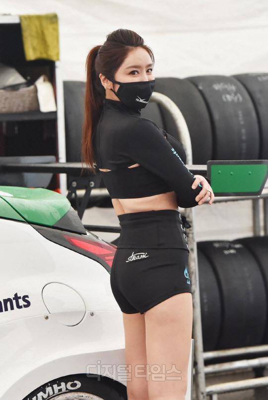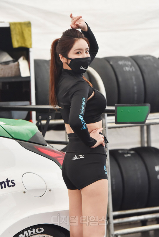 2K Body팀을 스폰서하는 스트림 컴퍼니(Stream company) 소속 레이싱모델 김하음이 경기도 용인시 에버랜드 스피드웨이에서 진행된 '2021 CJ대한통운 슈퍼레이스 챔피언십' 개막전에서 포즈를 취하고 있다.