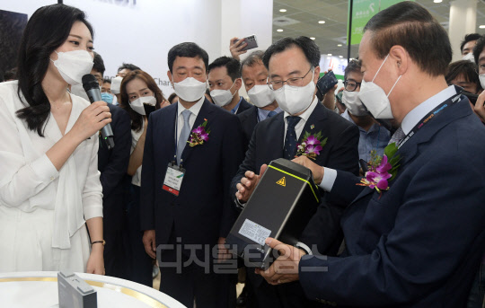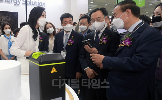 문승욱 산업통상자원부 장관이 9일 서울 강남구 코엑스에서 열린 인터배터리 전시회에서 삼성SDI의 교체형 배터리팩을 살펴보고 있다. 오른쪽부터 전영현 삼성SDI 사장, 문 장관, 민경준 포스코케미칼 대표, 지동섭 SK이노베이션 사업대표.