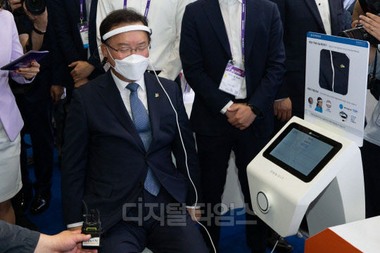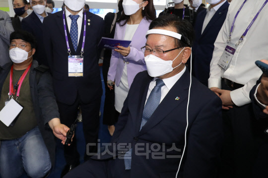 김부겸 국무총리가 9일 서울 강남구 코엑스에서 열린 바이오 코리아 2021에서 옴니씨앤에스의 옴니핏 제품을 제험해보고 있다.