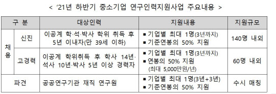 중소벤처기업부는 연구인력 확보에 어려움을 겪고 있는 중소기업 지원을 위해 '2021년 하반기 중소기업 연구인력 지원사업'에 참여할 중소기업을 모집한다고 14일 밝혔다.