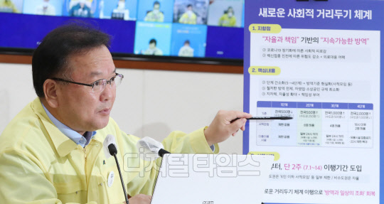 김부겸 국무총리가 20일 오후 서울 종로구 세종대로 정부서울청사에서 열린 코로나19 중앙재난안전대책본부 회의에서 새로운 사회적 거리두기 체계를 발표하고 있다.박동욱기자 fufus@dt.co.kr