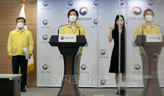 유은혜 사회부총리 겸 교육부 장관과 권덕철 보건복지부 장관이 20일 서울 종로구 세종대로 정부서울청사에서 코로나19 중앙재난안전대책본부 정례브리핑을 하고 있다. 이날 유 부총리는 2학기 전면 등교를 위한 이행 방안 등을 발표했다.박동욱기자 fufus@dt.co.kr