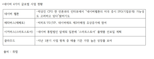 주력 서비스인 웹툰, 이커머스(전자상거래), 메타버스(가상현실), 클라우드 등 4대 플랫폼을 앞세워 해외 시장 공략을 본격화 하고 있다.