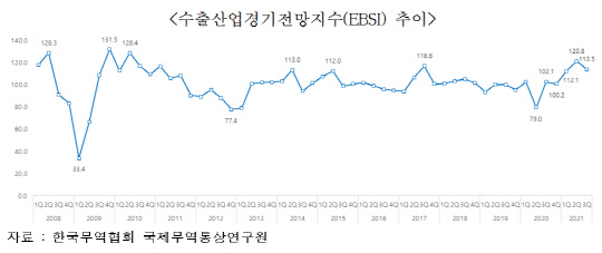 지수가 100을 넘으면 앞으로 수출 여건이 지금보다 개선될 것으로 본다는 뜻이다. EBSI는 1분기(112.1)와 2분기(120.8)에 이어 3개 분기 연속 110을 웃돌았다.