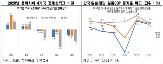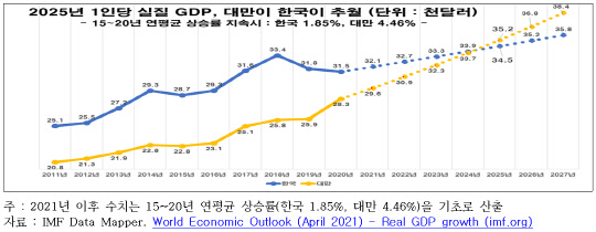 전경련은 대만이 이 같은 성장세(2015~2020년 연 평균 4.46%)를 이어갈 경우, 지난 2003년 한국에 역전당한 1인당 GDP(국내총생산)를 2025년 다시 재역전할 수 있을 것으로 예측했다. 2019년 기준 1인당 실질 GDP는 한국이 3만1846달러로 세계 32위, 대만은 2만5936달러로 39위다.