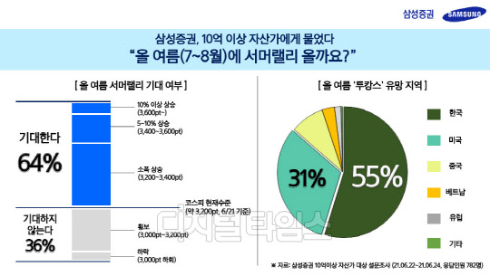 삼성증권이 지난달 22∼24일 10억원 이상 금융자산 보유 자사 고객 782명을 대상으로 실시한 온라인 설문조사 결과, 7~8월 서머랠리를 예상하느냐는 물음에 63.9%가 기대한다고 답했다.