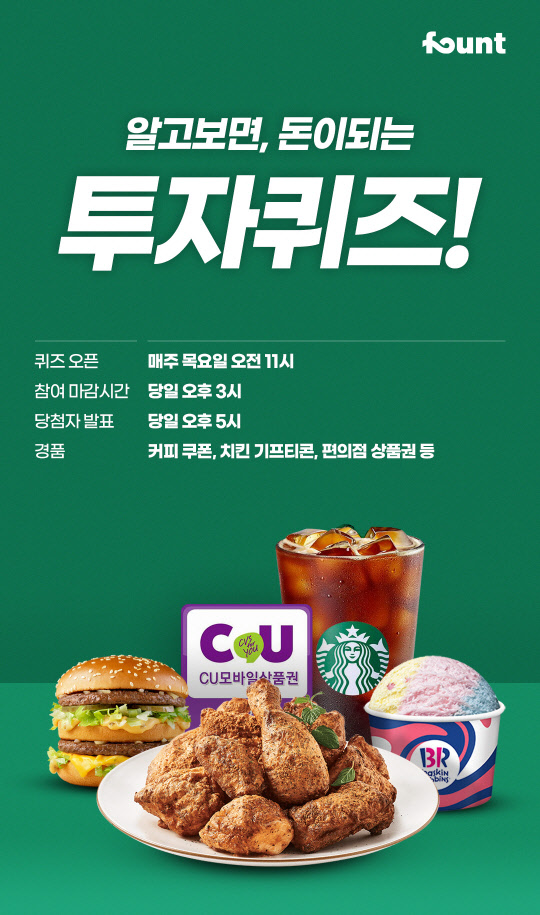 파운트는 투자 퀴즈를 통해 파운트 고객들이 금융지식을 쌓는 것은 물론 재미와 경품까지 모두 챙길 수 있는 앱테크(어플리케이션을 활용한 재테크)를 경험하도록 할 예정이다.