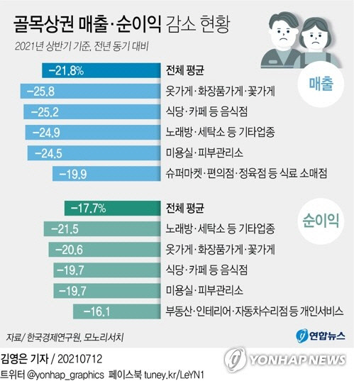 업종별 매출액 감소폭을 보면 ▲옷가게·화장품가게·꽃가게 -25.8% ▲식당, 카페 등 음식점 -25.2% ▲노래방·세탁소 등 기타업종 -24.9% ▲미용실·피부관리소 -24.5% ▲슈퍼마켓, 편의점, 정육점 등 식료 소매점 -19.9% ▲부동산, 인테리어, 자동차수리점 등 개인서비스 -19.4% ▲학원(예체능 포함)이 -16.3%로 줄어든 것으로 집계됐다.