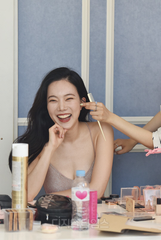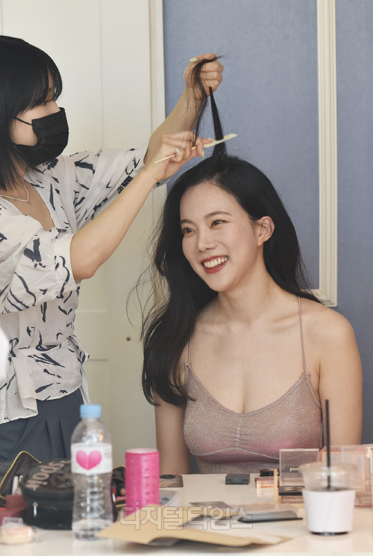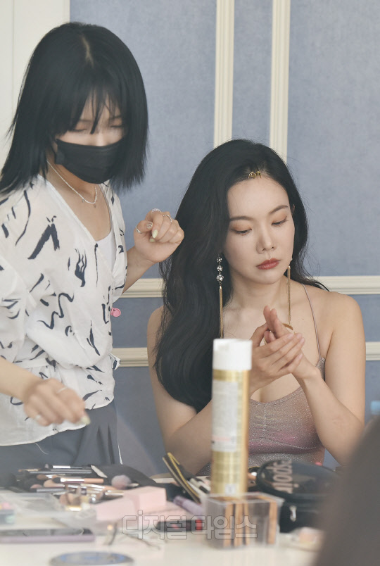 코미디언 출신 가수 김나희가 서울시 송파구 파로스 호텔에서 진행된 글로벌 남성 매거진 MAXIM(맥심) 표지 촬영현장에서 화장을 고치고 있다. 지난 2020년 12월호 맥심에 발랄한 원피스 화보로 출연한 김나희는, 2021년 5월호 표지를 장식했다.