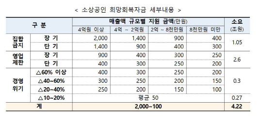 소상공인 희망회복자금은 총 4조2200억원의 예산이 배정됐다. 이 자금은 집합금지 이행 사업체에 대해 300만원부터 최대 2000만원을, 영업제한 업체는 200만원∼900만원까지 각각 지원한다.