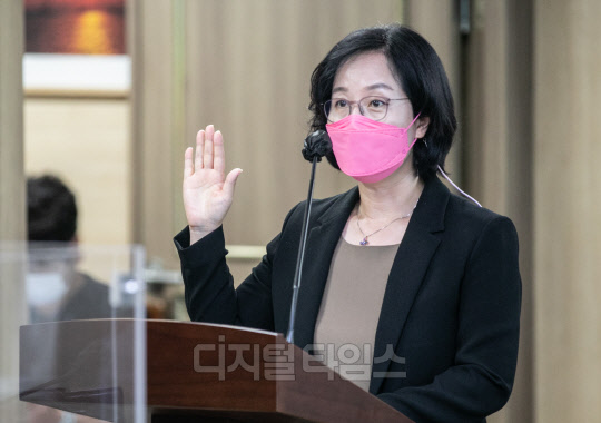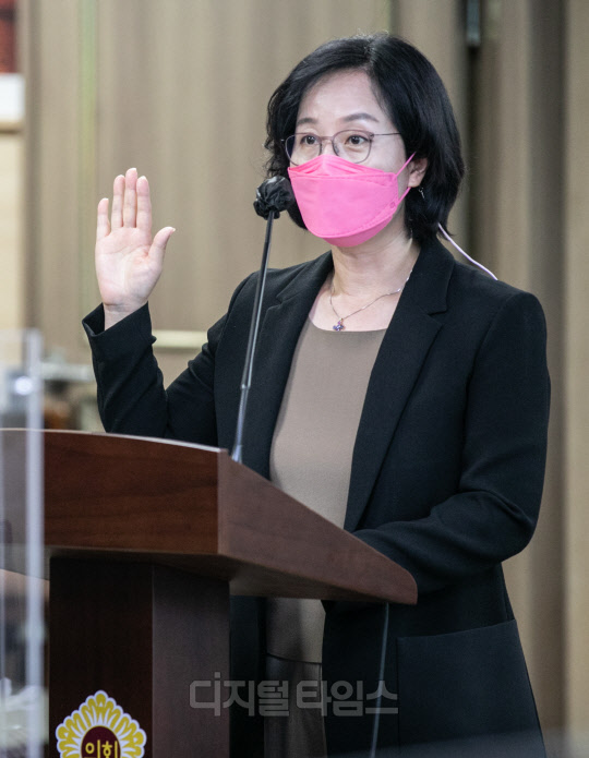 김현아 서울주택도시공사(SH) 사장 후보자가 27일 중구 서울시의회 별관에서 열린 인사청문회에서 선서를 하고 있다.