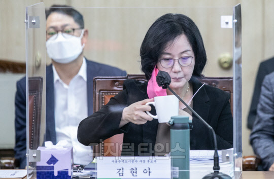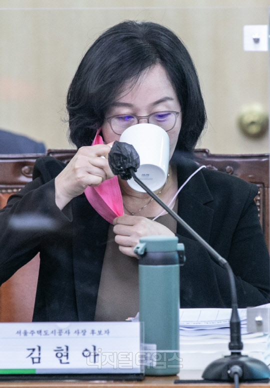 김현아 서울주택도시공사(SH) 사장 후보자가 27일 중구 서울시의회 별관에서 열린 인사청문회에 앞서 음료를 마시고 있다.