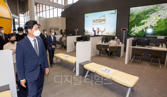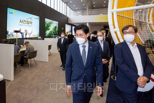 노형욱 국토교통부 장관이 28일 서울 송파구 장지동에 마련된 3기 신도시 사전청약 접수현장을 방문해 둘러보고 있다.
