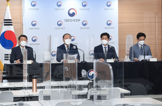 홍남기 경제부총리 겸 기획재정부 장관이 28일 서울 종로구 정부서울청사에서 열린 부동산 관계부처 합동브리핑에서 부동산 시장 관련 대국민 담화를 발표하고 있다. 왼쪽부터 은성수 금융위원장, 홍 부총리, 노형욱 국토교통부 장관, 김창룡 경찰청장.