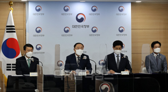 홍남기 경제부총리 겸 기획재정부 장관이 28일 서울 종로구 정부서울청사에서 열린 부동산 관계부처 합동브리핑에서 부동산 시장 관련 대국민 담화를 발표하고 있다. 왼쪽부터 은성수 금융위원장, 홍 부총리, 노형욱 국토교통부 장관, 김창룡 경찰청장.