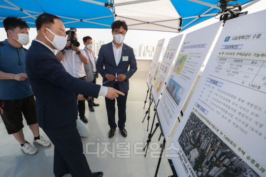 [포토] 서울 신길2지구 공공주택 공급현장 설명 듣는 홍남기 경제부총리