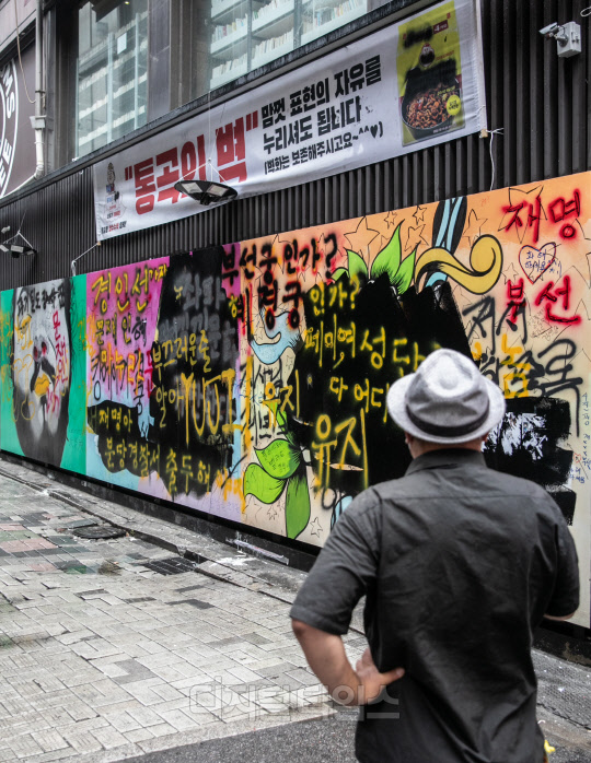 [포토] 사라진 쥴리 벽화, 여권 비방 낙서판으로 변해