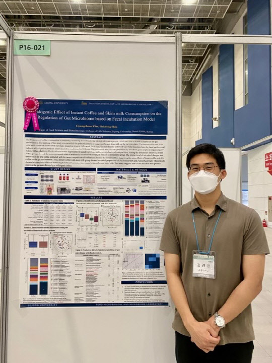 김 대학원생은 '장내 마이크로바이옴 배양 시스템을 활용한 커피 및 스킴 밀크가 장내 균총에 미치는 유익한 효과 규명 연구(Bifidogenic Effect of Instant Coffee and Skim milk Consumption on the Regulation of Gut Microbiome based on Fecal Incubation Model)'를 주제로 포스터 발표를 진행했다.