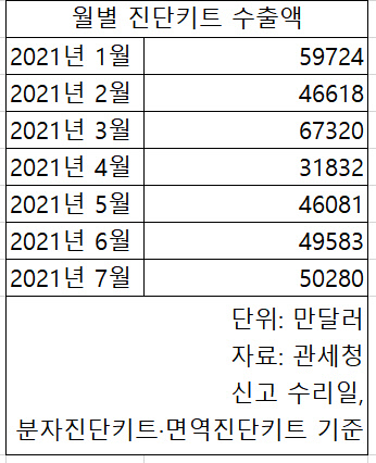 16일 관세청 수출입무역통계에 따르면 올 1~7월 국내 진단키트 수출액은 총 35억1438만달러(약 4조1083억원)에 달하는 것으로 나타났다. 월별로 보면 지난해 12월(9억3587만달러) 수출액이 정점을 기록한 이후 4월까지 수출액이 급감하다 5월부터 다시 증가하는 추세다.