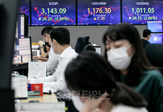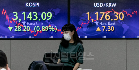 코스피가 전 거래일보다 28.20포인트 하락한 3,143.09로 장을 마친 17일 서울 중구 하나은행 딜링룸에서 직원들이 분주히 업무를 보고 있다. 코스닥은 29.73포인트 하락한 1,011.05, 원·달러 환율은 7.3원 오른 1,176.3원으로 마감했다.