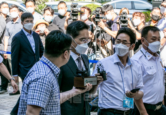 삼성물산·제일모직 합병 과정에서 인위적으로 제일모직 주가를 띄우고 삼성물산 주가를 낮추는 등 부당한 행위를 지시한 혐의를 받고 있는 이재용 삼성전자 부회장이 19일 서울 서초구 중앙지방법원에서 열린 1심 속행 공판에 출석하고 있다.