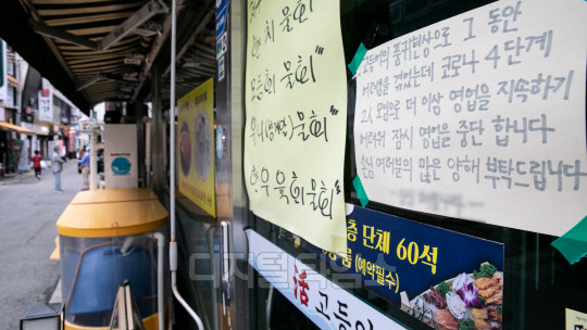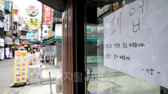 사회적 거리두기 4단계 연장을 하루 앞둔 22일 서울 종로구 젊음의거리 한 음식점에 휴업 관련 안내문이 게시돼 있다.