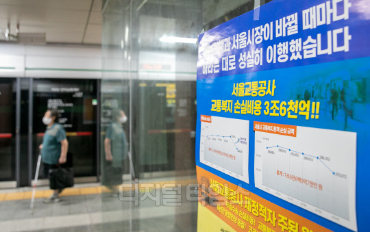 서울을 포함한 전국 6개 도시 지하철 노조가 파업에 돌입할 전망인 23일 서울 지하철 역사 내에 서울교통공사 노동조합의 선전물이 붙어 있다.