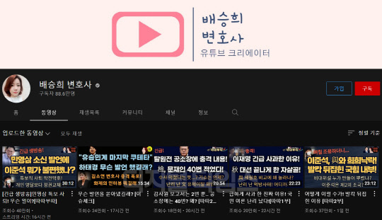 2위는 구독자 수 88만 명, 누적 조회 수 3억 9300만 회를 기록하고 있는 채널 '배승희 변호사'다. 채널 운영 1년 만인 지난해 3월 구독자 50만 명을 끌어모으고 현재까지 꾸준한 인기를 누리고 있다. 구독자 수가 비슷한 다른 채널에 비해 조회 후 대비 '좋아요'수와 댓글 수가 많은, 반응도와 긍정도가 높은 채널이다.