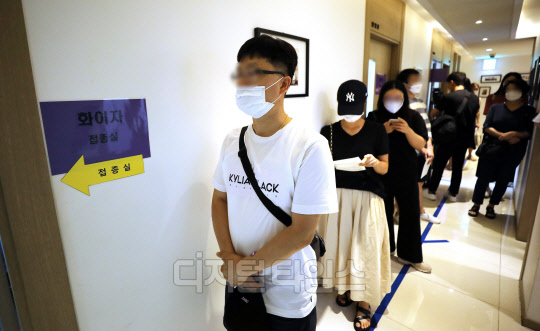 본격적인 청장년층(18∼49세) 백신 접종이 시작된 26일 서울 관악구 사랑의병원에서 시민들이 화이자 백신을 접종을 위해 대기하고 있다.