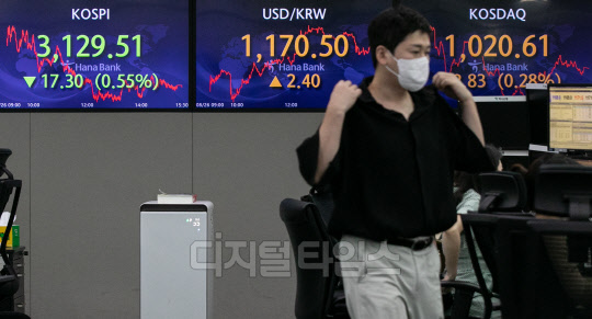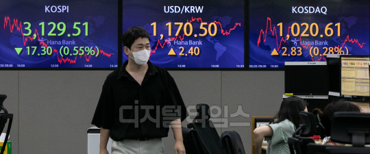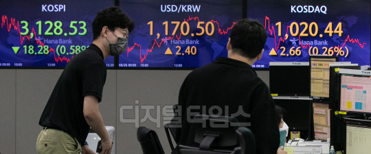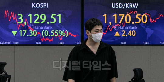 장 초반 소폭 상승했던 코스피가 26일 한국은행의 기준금리 인상 이후 약세전환해 전장보다 18.28포인트(0.58%) 내린 3128.53으로 마감됐다. 원·달러 환율은 전 거래일 대비 2.4원 오른 1170.5원으로 거래를 마쳤다. 사진은 이날 명동 하나은행 딜링룸 모습.