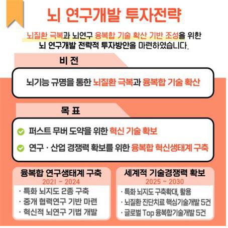 또한 뇌질환 극복을 위해 질환유형별 혁신적 치료기술과 차세대 플랫폼 기술개발 지원을 확대하고, 뇌 작동원리의 근원적 이해를 위한 연구도 확대한다.