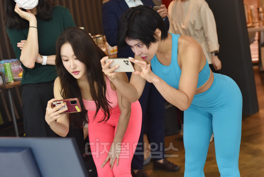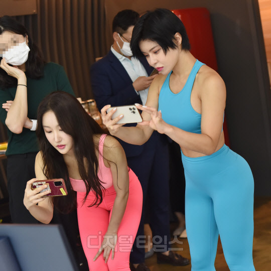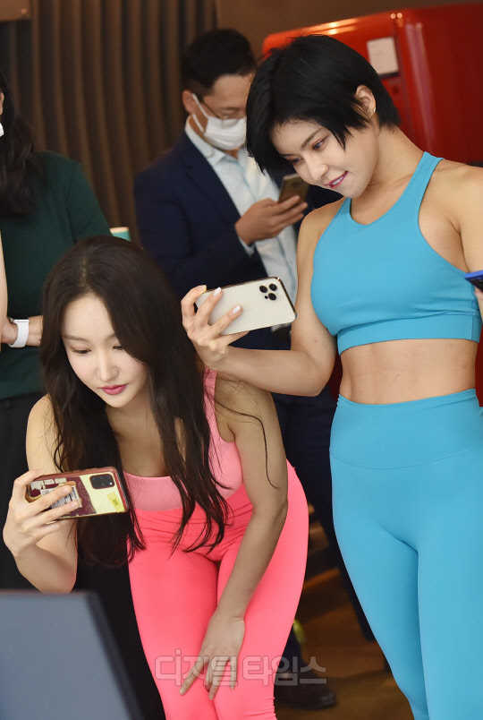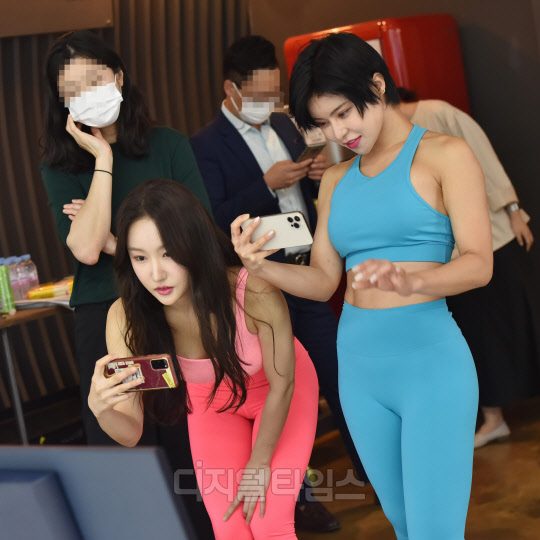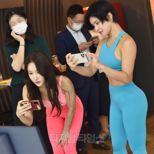 머슬마니아 출신 피트니스 모델 김자연, 배이지가 경기도 성남시 한 스튜디오에서 진행된 헬스 남성잡지 MAXQ(맥스큐) 11월호 표지 및 '300FIT meta' 촬영현장에서 모니터링을 하고 있다.