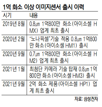 삼성전자는 지난 2019년 업계 최초로 1억 화소를 뛰어넘는 이미지센서를 출시한 데 이어 2년 만에 다시 신기록을 세웠다. 아이소셀 HP1은 기존 1억800만 화소 제품보다 화소 수를 약 85% 많이 탑재하면서도 크기 증가는 최소화 했다.
