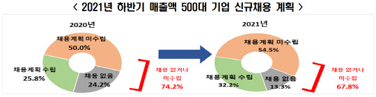한국경제연구원은 여론조사업체 리서치앤리서치에 의뢰해 매출액 500대 기업(응답기업 121개사)을 대상으로 '2021년 하반기 신규채용 계획'을 조사한 결과, 응답 기업의 67.8%가 신규채용 계획을 수립하지 못했거나 1명도 채용하지 않을 것이라고 답했다고 밝혔다. 채용계획 미수립 기업의 응답률은 54.5%, 신규채용 '0'인 기업은 13.3%였다. 한경연 측은 "신규채용 계획이 없거나 계획을 수립하지 못한 기업 비중이 전년 동기(74.2%)보다 다소 줄긴 했지만, 작년에 코로나19 사태로 국내외 경기가 워낙 좋지 않았던데 따른 기저효과 때문"이라며 "최근의 코로나 4차 대유행의 기세를 감안하면 채용시장의 한파는 지속될 것"이라고 말했다.