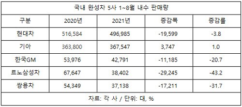 외자계 3사는 최근 노사간 임단협이 마무리되면서 수출 우려도 어느 정도 해소된 모습이다. 하지만 반도체 부족 여파 및 현대차·기아에 비해 신차 경쟁력이 약하다는 점에서 내수 시장에서는 고전을 면치 못하고 있다. 외자계 3사의 올 1~8월 국내 판매량은 11만8331대로 작년 동기 대비 32.8% 감소해, 같은 기간 현대차·기아(-1.8%)와 격차가 더욱 벌어졌다.특히 르노삼성의 경우 올해 수출 실적이 작년보다 126.5%(2만892대) 크게 늘었지만 내수 부진으로 전체 판매량은 9.9%(8353대) 줄어 국내 시장에서의 판매 회복이 시급한 상황이다.