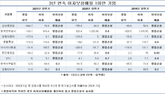 이자보상배율이 1 미만인 기업은 상반기 기준으로 2019년 37개 사에서 코로나19 팬데믹이 닥친 2020년 61개 사로 24곳이 늘어난 바 있다. 그러나 올해 들어 일부 기업의 실적이 크게 개선되면서 작년 상반기보다 38곳이 감소했다.