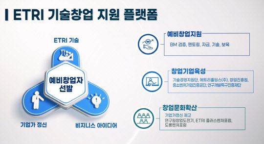 ETRI는 '기술창업'이라는 말이 생소했던 지난 1990년대부터 창업지원제도를 만들어 IT 기술창업에 나섰고, 2004년에는 창업과 기술사업화를 담당하는 전담 조직을 신설, 운영하고 있다. 여기에 2010년에는 출연연 최초로 기술지주회사인 'ETRI 홀딩스'를 설립해 기술과 현금출자를 통한 기술창업 전문성과 액셀러레이팅 역할을 강화하는 등 기술창업을 선도하고 있다.