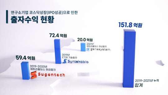 이같은 노력 덕분에 지난달 기준 창업기업 67개사, 연구소기업 74개사 등을 설립을 지원했고, 연구소기업 중 수젠텍과 신테카바이오, 진시스템 등 3개 기업은 코스닥에 상장해 ETRI는 152억원의 회수 수익을 올리는 등 기술창업이 가져다 주는 진가를 여실히 보여주고 있다. 기술창업은 기업 매출과 생존율, 고용효과 등에서 일반창업을 능가한다.