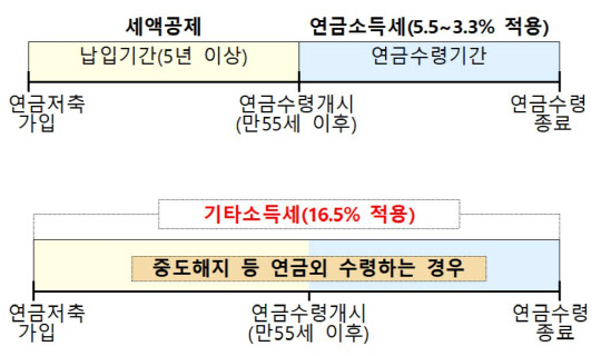 은퇴준비자의 경우 연금저축·IRP에서 연금수령 시 세율이 낮은 연금소득세(5.5~3.3%)를 적용받기 위해 연금수령 기간·금액을 조정할 필요가 있다고 안내했다.